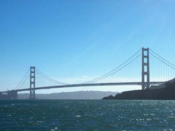 Where the Bay empties into the Pacific Ocean it is spanned by the Golden Gate Bridge, the second longest suspension bridge in the US, after the Verrazano Bridge in New York City. The water under the bridge is 360 feet deep. The main portion of the Bay has an average depth of 43 feet. The Bay has a shoreline of 240 miles.