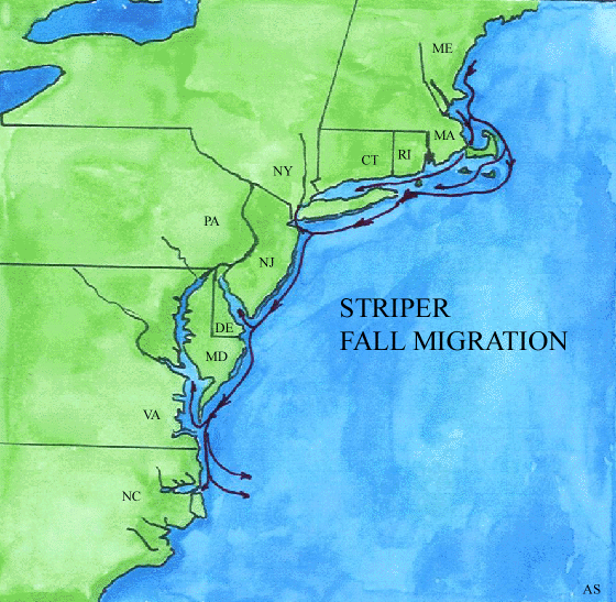 Striped bass migrate south in the fall seeking warmer water. Stripers bass prefer water temperatures to be between 55 and 68 degrees fahrenheit. Stripers winter over in deeper, warmer, water off of the Virginia and North Carolina coasts.