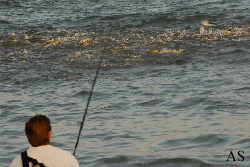 Soon the blitzes started occurring closer to the shore line, and in range of the surf fishermen. There was quite a crowd, but everyone was polite and friendly, and all got a chance to fish.